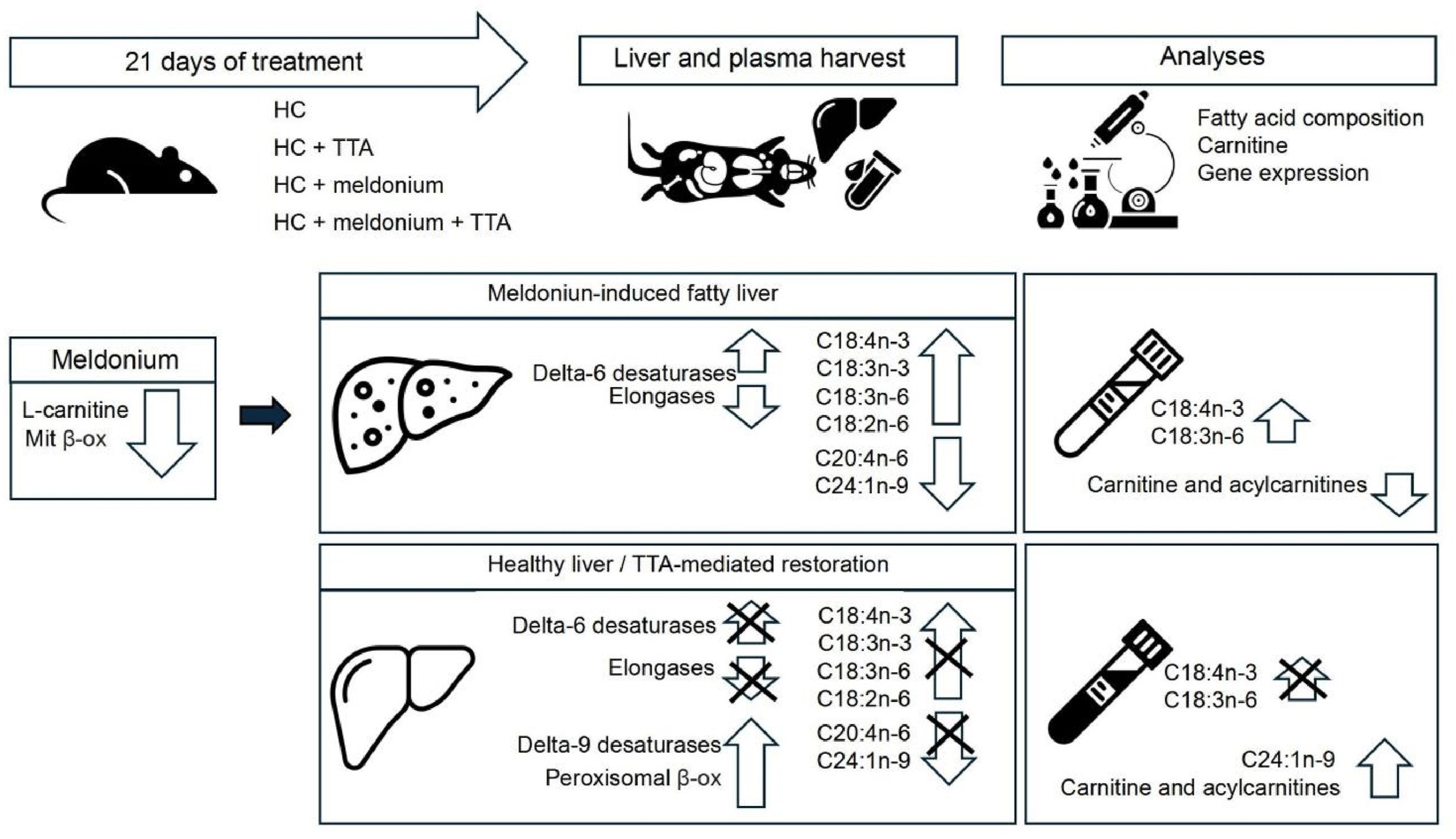 See the article: Bodil, B., et al., Meldonium-induced steatosis is associated with increased delta 6 desaturation and reduced elongation of n-6 polyunsaturated fatty acids, Liver Research, Volume 8, Issue 3, 2024, Pages 152-164, https://doi.org/10.1016/j.livres.2024.09.001.
