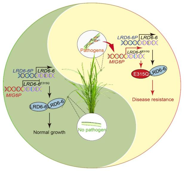 The team then constructed a gene expression cassette, MIG6P:LRD6-6E315Q, by driving the DN variant LRD6-6E315Q with the MIG6P promoter, and introduced it into the rice cultivar Taipei 309 (TP309). The engineered rice lines carrying this cassette showed no abnormal growth or yield loss under pathogen-free conditions, matching the agronomic performance of wild-type TP309. When challenged by pathogens, however, MIG6P was rapidly activated, driving the expression of LRD6-6E315Q to trigger an immune response.