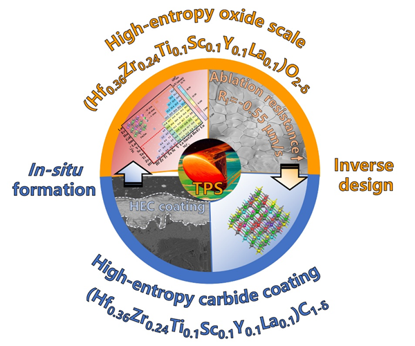 The researchers designed (Hf0.36Zr0.24Ti0.1Sc0.1Y0.1La0.1)C1-δ (HEC) coatings using the inverse theoretical method and validated through ablation resistance experiments. The linear ablation rate of the HEC coatings was measured at -1.45 μm/s, which is only 4.78% of that of pristine HfC coatings after oxyacetylene ablation at 4.18 MW/m2, demonstrating excellent ablation resistance. HEC coatings also exhibit higher toughness, with a Pugh’s ratio of 1.55 compared to HfC 1.30.